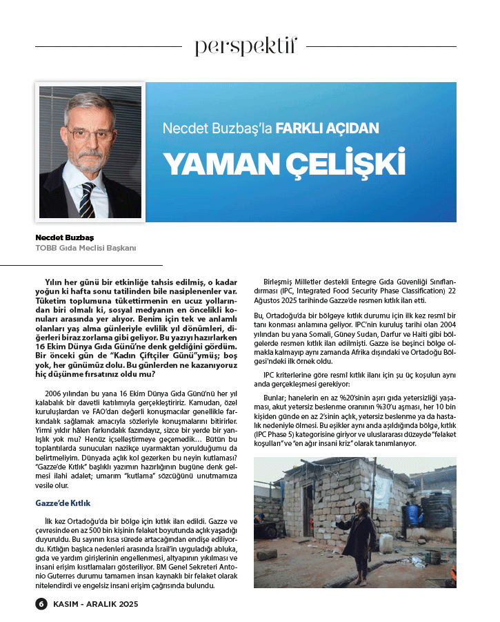 Yirmi yıldır hâlen farkındalık fazındayız, sizce bir yerde bir yanlışlık yok mu? Henüz içselleştirmeye geçemedik… Bütün bu toplantılarda sunucuları nazikçe uyarmaktan yorulduğumu da belirtmeliyim. Dünyada açlık kol gezerken bu neyin kutlaması? “Gazze’de Kıtlık” başlıklı yazımın hazırlığının bugüne denk gelmesi ilahi adalet; umarım “kutlama” sözcüğünü unutmamıza vesile olur.