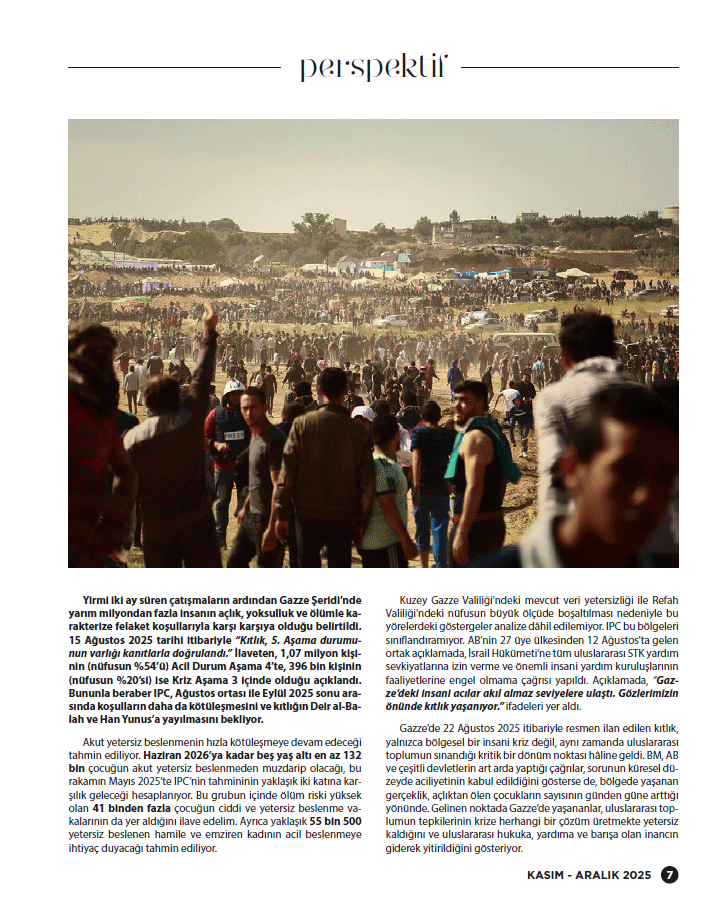 Gazze’de 22 Ağustos 2025 itibarıyla resmen ilan edilen kıtlık, yalnızca bölgesel bir insani kriz değil, aynı zamanda uluslararası toplumun sınandığı kritik bir dönüm noktası hâline geldi. BM, AB ve çeşitli devletlerin art arda yaptığı çağrılar, sorunun küresel düzeyde aciliyetinin kabul edildiğini gösterse de, bölgede yaşanan gerçeklik, açlıktan ölen çocukların sayısının günden güne arttığı yönünde. Gelinen noktada Gazze’de yaşananlar, uluslararası toplumun tepkilerinin krize herhangi bir çözüm üretmekte yetersiz kaldığını ve uluslararası hukuka, yardıma ve barışa olan inancın giderek yitirildiğini gösteriyor.