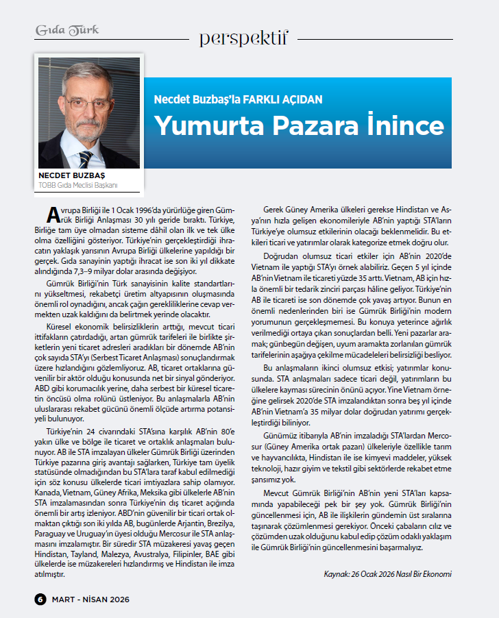 Avrupa Birliğe ile 1 Ocak 1996 ‘da yürürlüğe giren Gümrük Birliği Anlaşması 30 yılı geride bıraktı. Türkiye Birliğe tam üye olmadan sisteme dahil olan ilk ve tek ülke olma özelliğini gösteriyor. Türkiye’nin gerçekleştirdiği ihracatın yaklaşık yarısının Avrupa Birliği ülkelerine yapıldığı bir gerçek. Gıda sanayinin yaptığı ihracat ise son iki yıl dikkate alındığında 7.3 – 9 milyar dolar arasında değişiyor.