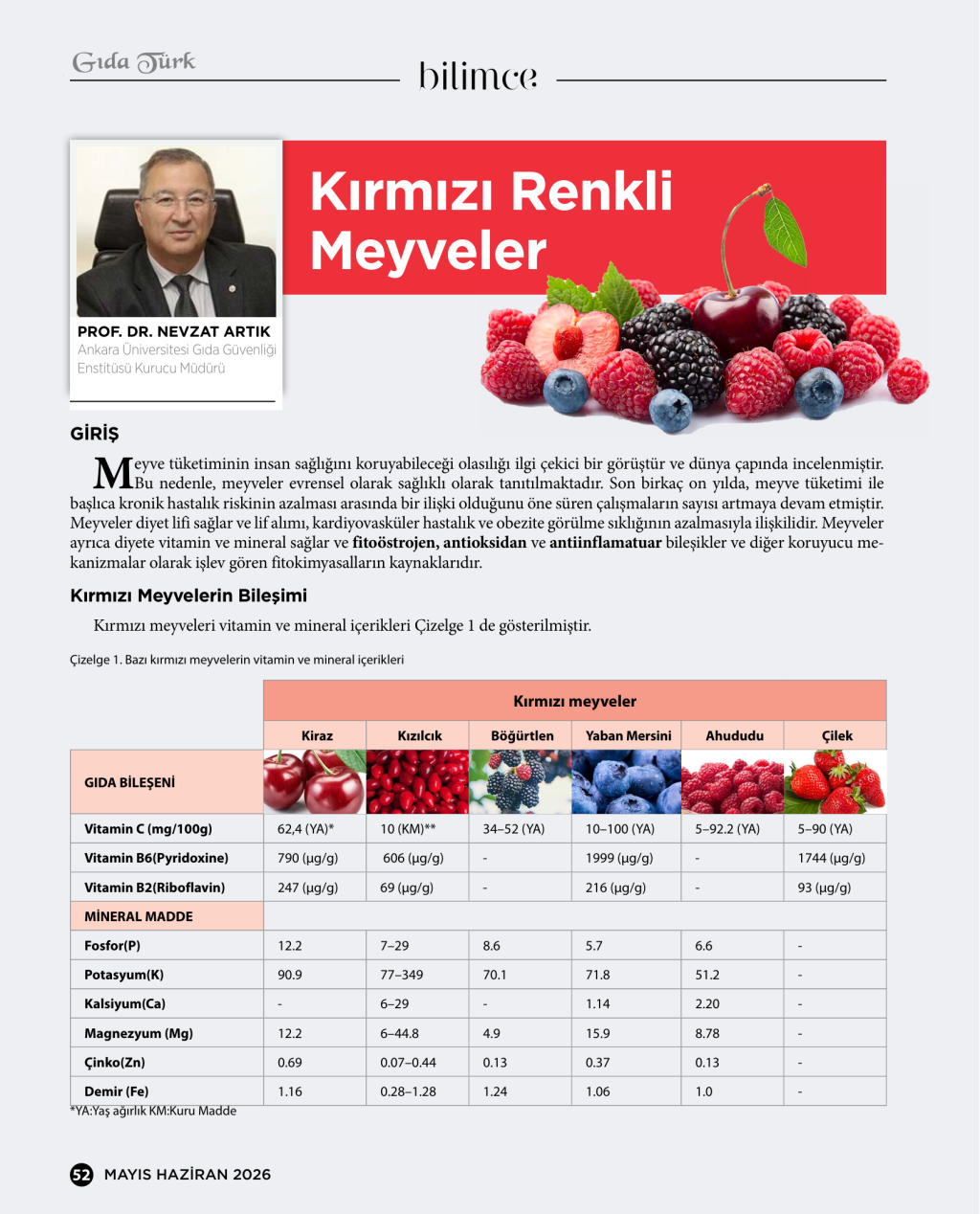 SONUÇ: Günümüzde insanlar sağlıklı beslenmeye çok önem vermektedir. Bu nedenle, özellikle Rosaceae (çilek, ahududu, vişne, böğürtlen ve kiraz) ve Ericaceae (yaban mersini, kızılcık) gibi çeşitli familyalara ait kırmızı meyvelerin tüketimi, sadece yüksek besin değerleri, karakteristik tatları, aromaları ve nutrasötik özellikleri nedeniyle tüketimi önemli ölçüde artmıştır. Kırmızı meyvelerin, vitaminler (A, C ve E vitaminleri), mineraller (kalsiyum, fosfor, demir, magnezyum, potasyum, sodyum, manganez ve bakır), diyet lifi ve antioksidanlar dahil olmak üzere birçok biyoaktif bileşen ve besin maddesinin iyi bir kaynağı olduğu kabul edilmektedir